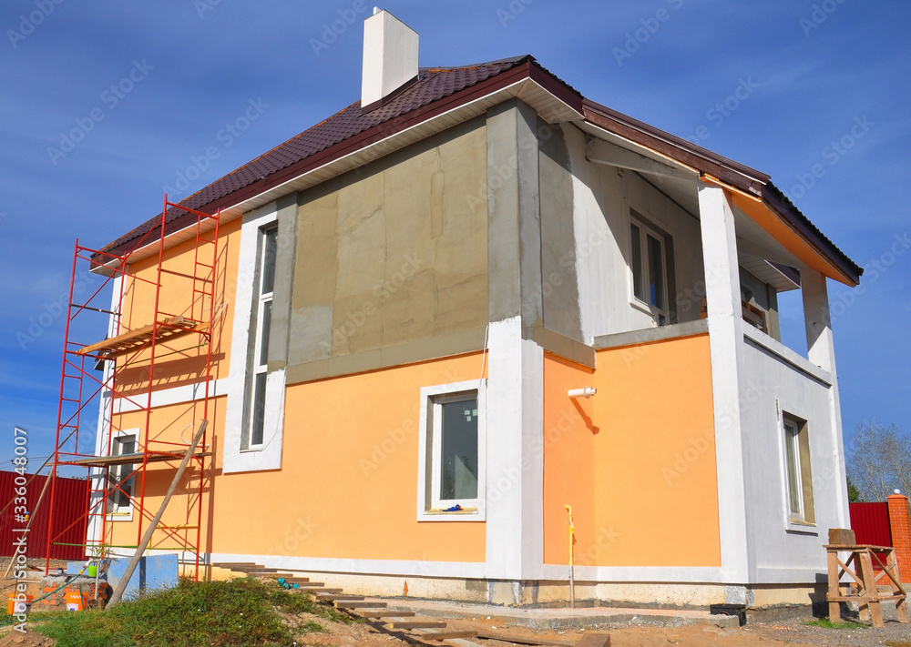 Painting Renovation A Modern House With Stucco House Finish Stucco Siding And Metal Roof Using Scaffolding Stock Photo Adobe Stock